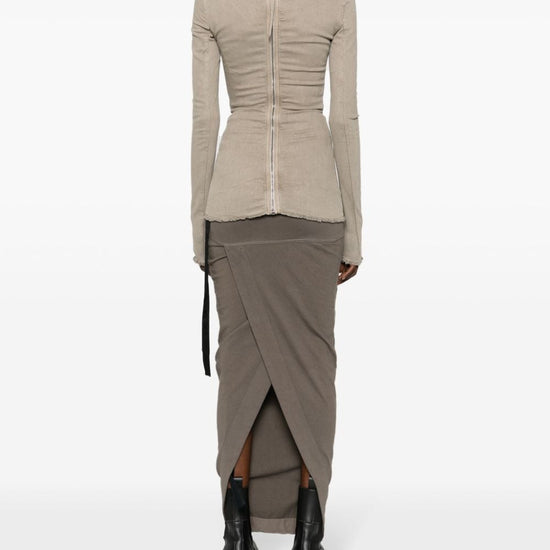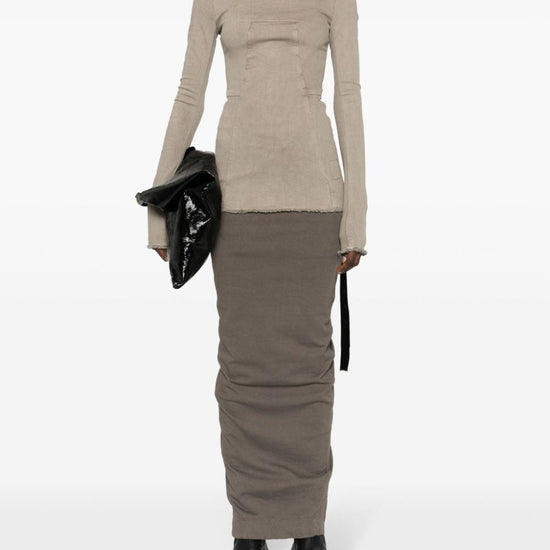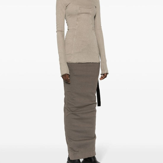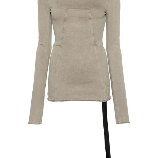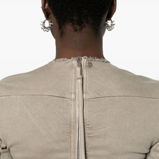 Taupe grey cotton blend denim raw-cut edge seam detailing round neck long sleeves flared design rear zip fastening long sleeve denim t-shirt size and fit - this piece fits true to size. we recommend you get your regular size. model is 1,75m / 5ft 8in wearing size s