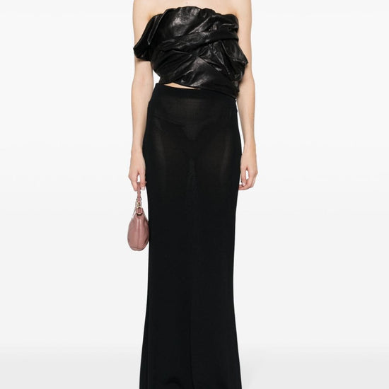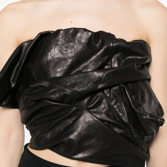 Black calf leather draped design asymmetric design strapless cropped full lining concealed rear zip fastening draped leather bustier size and fit - this piece fits true to size. we recommend you get your regular size. model is 1,75m / 5ft 8in wearing size 40 (it)
