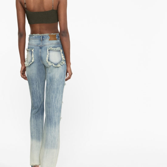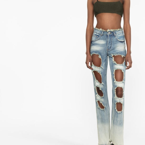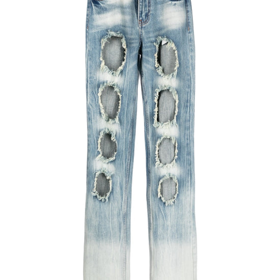 Distressed-effect straight-leg jeans from rui featuring light blue, cotton, washed denim, frayed brim, cut-out detailing, high waist, classic five pockets and front button fastening. cut-out detail denim jeans size and fit - this piece fits true to size. we recommend you get your regular size. model is 1,75m / 5ft 8in wearing size s