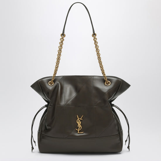 Saint laurent brown leather shopping bag with carré rive gauche stitching, featuring a metal cassandre logo with a gold finish on the front, chain shoulder strap, magnetic closure, drawstring on the sides, and a removable zip pouch. size and fit - width 35 cm x height 35 cm x depth 10 cm handle drop 32 cm