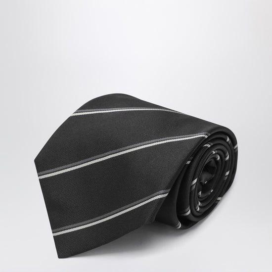 Saint laurent silk tie, characterized by a diagonal stripe pattern in brown, black, and white with a chain loop.