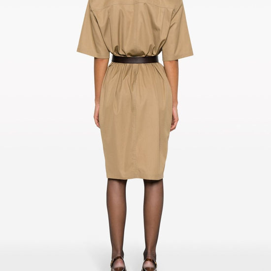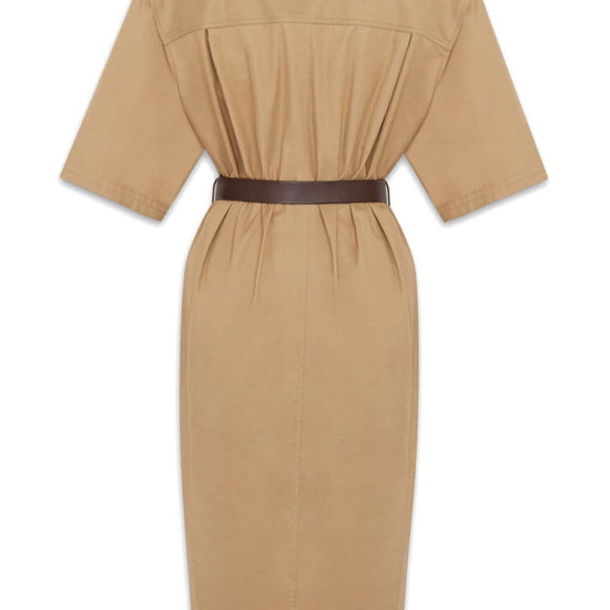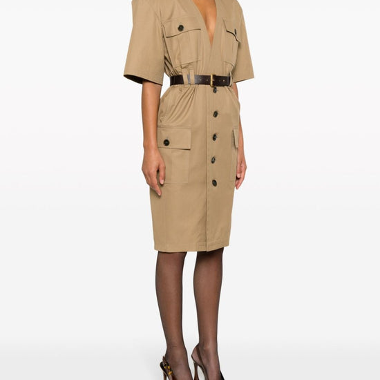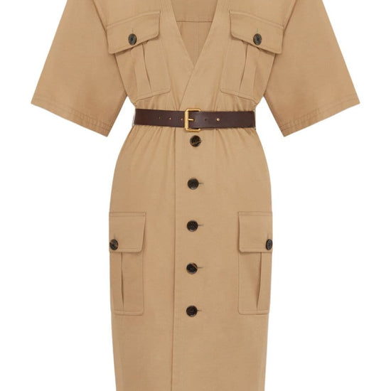 Beige cotton v-neck front button fastening short sleeves two chest flap pockets belted waist two front flap pockets straight hem cotton twill midi dress size and fit - this piece fits true to size. we recommend you get your regular size. model is 1,75m / 5ft 8in wearing size 36 (fr)