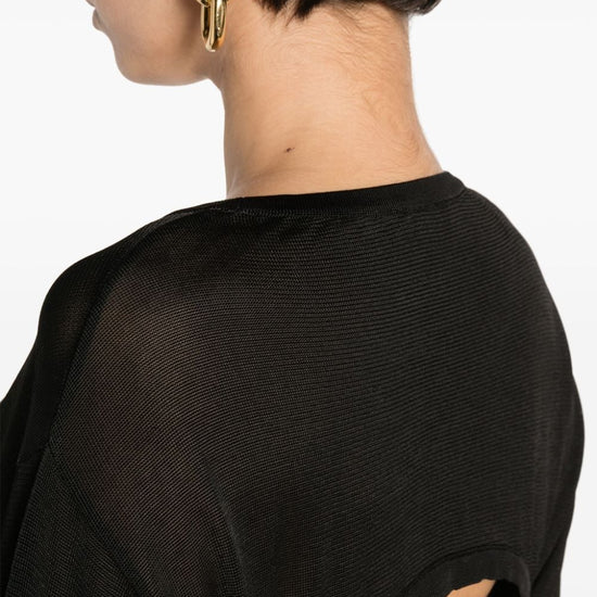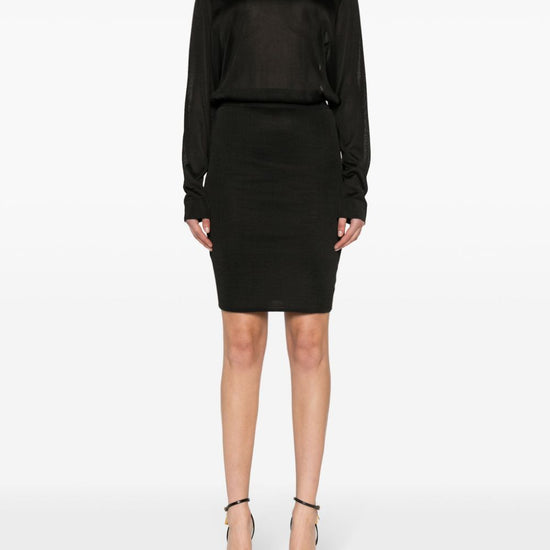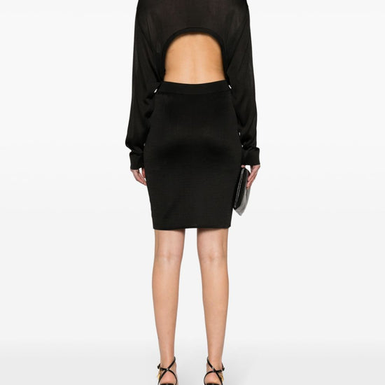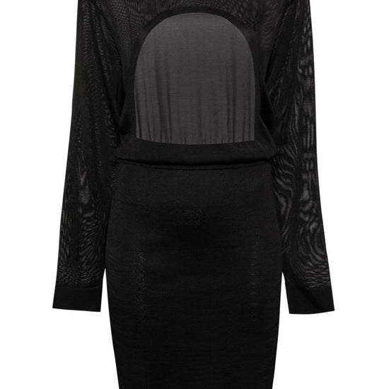 Black knitted construction semi-sheer construction boat neck open back drop shoulder long wide sleeves elasticated waistband fitted waistline pencil silhouette straight mid-length hem open-back knitted dress size and fit - this piece fits true to size. we recommend you get your regular size. model is 1,75m / 5ft 8in wearing size s