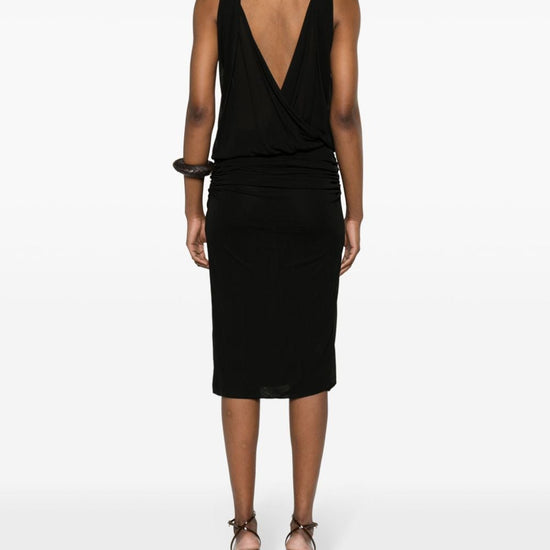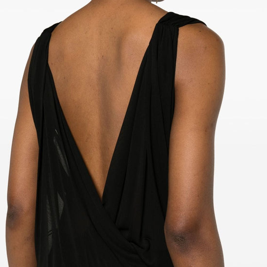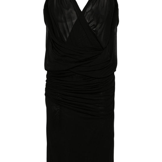 Black draped detailing plunging v-neck sleeveless ruched bodice straight hem mid-length full lining spalline, scollo v v-necked mini dress size and fit - this piece fits true to size. we recommend you get your regular size. model is 1,75m / 5ft 8in wearing size 36 (fr)