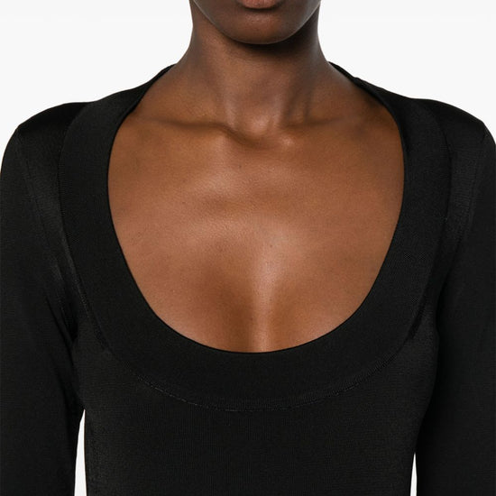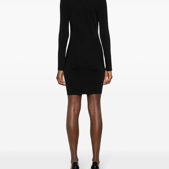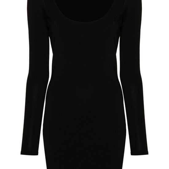Black stretch-design fine knit ribbed scoop neck long sleeves thigh-length unlined straight hem pull-on style knitted mini dress size and fit - this piece fits true to size. we recommend you get your regular size. model is 1,75m / 5ft 8in wearing size s