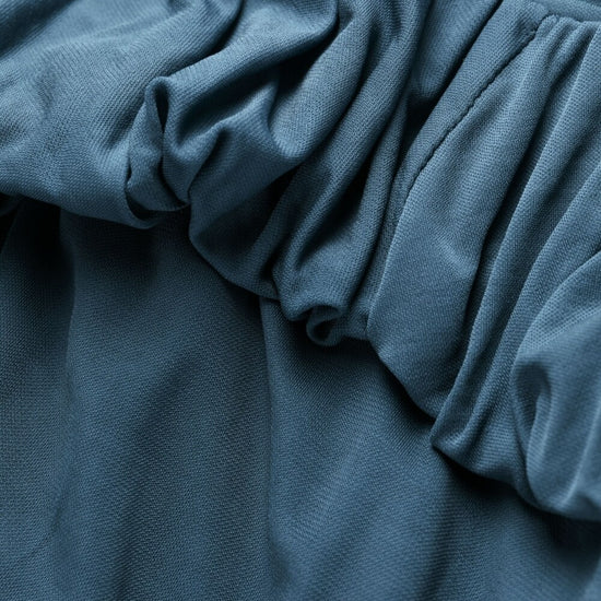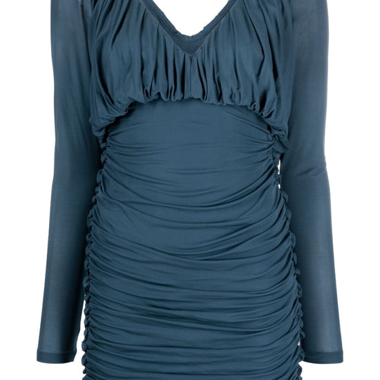 V-neck draped mini dress from saint laurent featuring blue, draped design, v-neck, v-back, long sleeves, curved hem and thigh-length. short jersey dress size and fit - this piece fits true to size. we recommend you get your regular size. model is 1,75m / 5ft 8in wearing size 36 (fr)