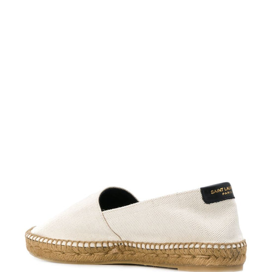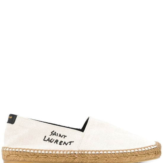Ivory logo-embroidered espadrilles from saint laurent featuring cotton-linen blend, logo print to the side, braided raffia sole, round toe and slip-on style. signature canvas espadrilles size and fit - heel 1 in / 2,5 cm; platform 0,8 in / 2 cm