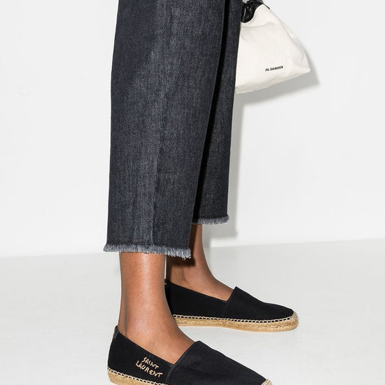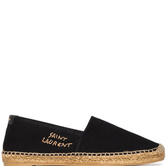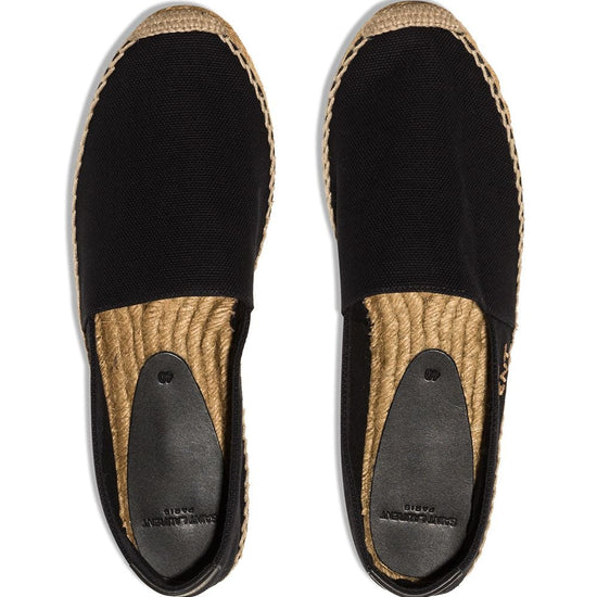 These black saint laurent logo canvas espadrilles are made in italy and feature an almond toe, a slip-on silhouette, embroidered branding and leather heel counters with gold foil detailing. they're set on woven jute midsoles and have rubber outsoles. rita heyworth and lauren bacall were the first actresses on film to wear espadrilles in the 1940s. you'll be following in their iconic footsteps by wearing this pair from saint laurent. signature canvas espadrilles size and fit - heel 1 in / 2,5 cm; platform 0,8 in / 2 cm