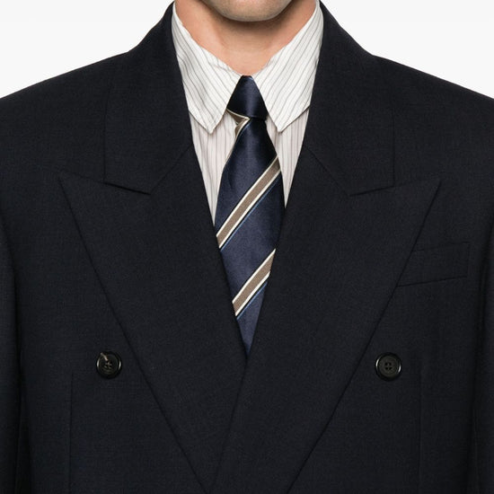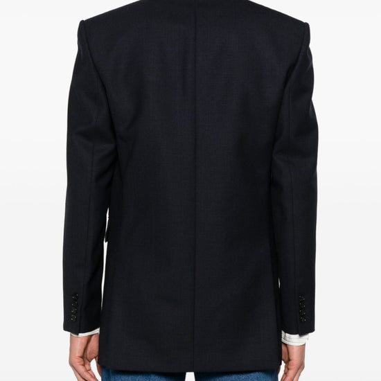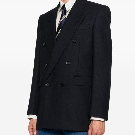 Dark blue double-breasted closure peak lapels long sleeves flap pockets straight hemline wool double-breasted jacket