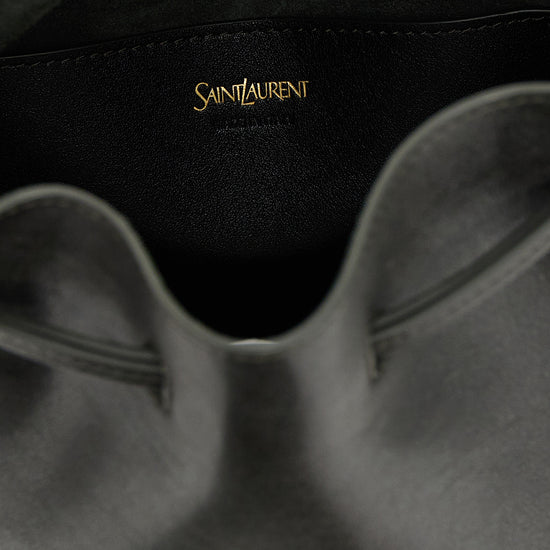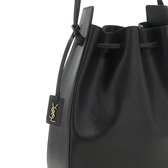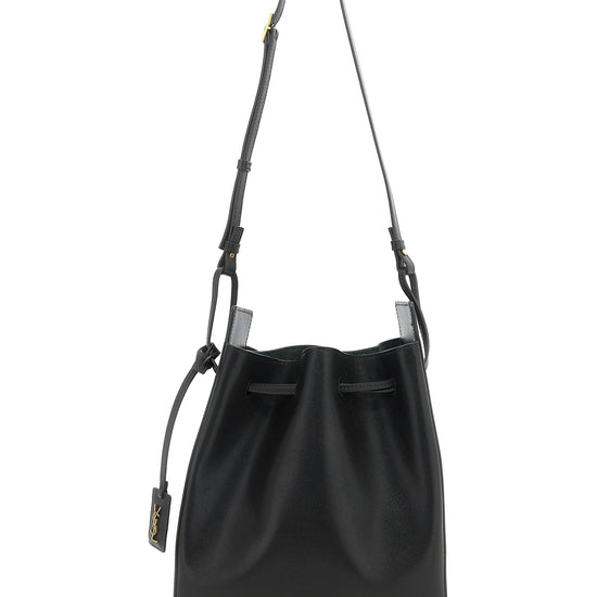 Large leather bucket bag, suede lining, removable leather keyring with metal cassandre logo, drawstring closure, adjustable and removable shoulder strap._x000d_