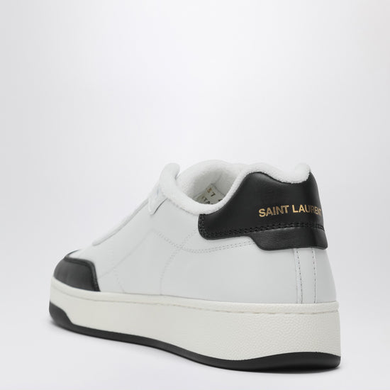 Black/white smooth leather sneakers by saint laurent featuring leather upper, round toe, lace-up fastening, logoed tongue, gold logo on side, black logoed padded heel and rubber sole.