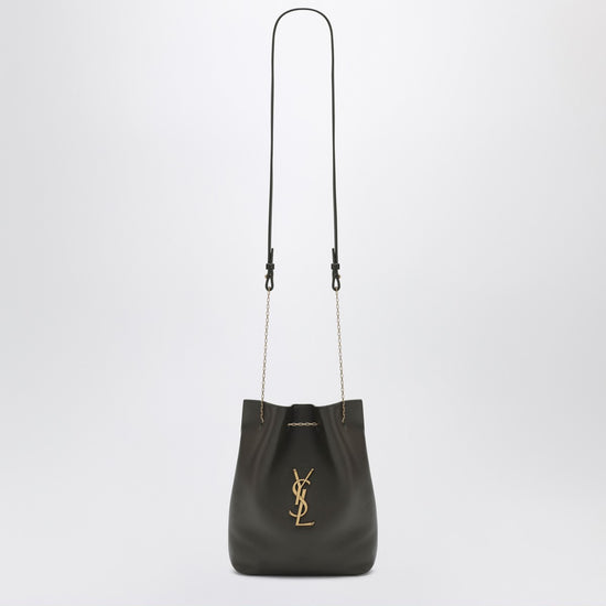 Saint laurent bucket bag in moss green lambskin leather, featuring chain shoulder strap with removable leather insert, front cassandre logo, bronze-tone metal hardware, drawstring closure, and one internal flat pocket. size and fit - width 20 cm x height 24 cm x depth 3 cm shoulder strap length 92 cm