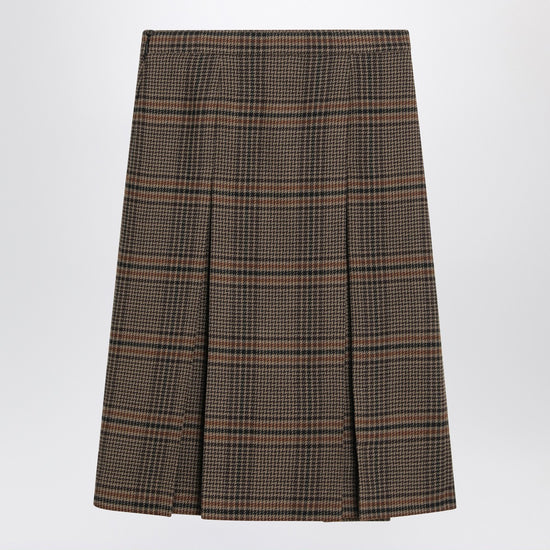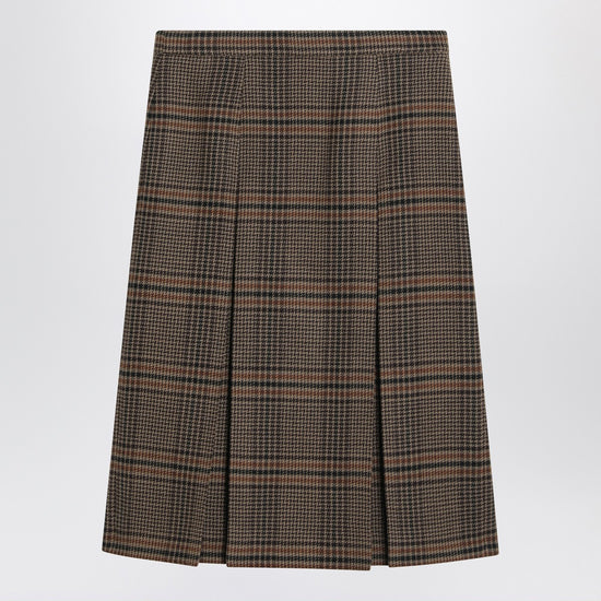 Brown and beige prince of wales patterned saint laurent midi skirt in wool, featuring a silk lining, zip closure on the side, two side pockets, and pleats at the front and back. size and fit - model wears size 38 fr model measurements: height: 178 cm chest: 83 cm waist: 63 cm hips: 91 cm