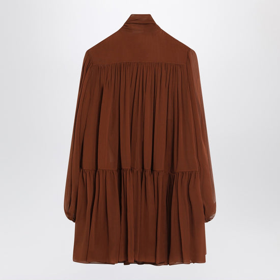 Saint laurent dress in rust-coloured silk crêpe, featuring long puff sleeves with buttoned cuffs, tiered skirt, front button closure, two side pockets, and a lavallière collar. size and fit - model wears size 34 fr model measurements: height: 179 cm chest: 82 cm waist: 65 cm hips: 90 cm