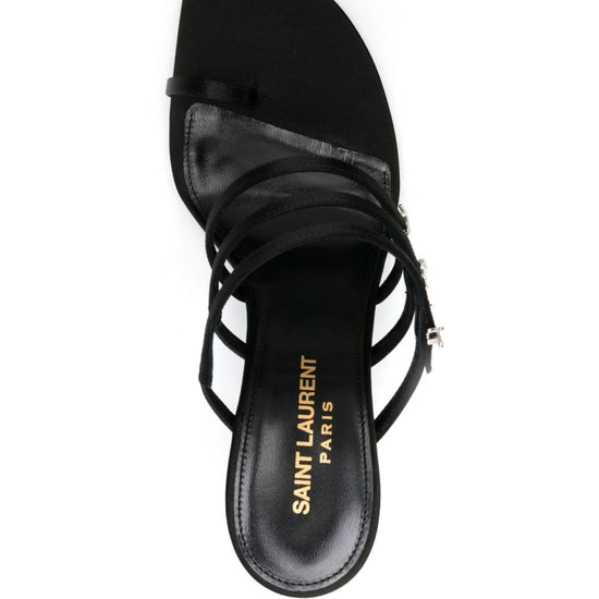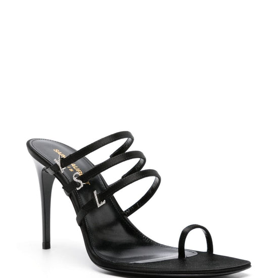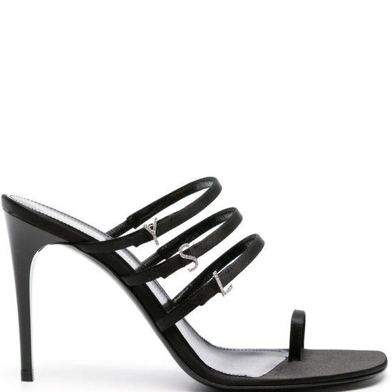 Black satin finish crystal embellishment appliqué logo square open toe open back multiple toe straps branded leather footbed 95mm high stiletto heel leather sole non-slip sole this piece comes complete with a protective dust bag. satin heel mules size and fit - heel 3,7 in / 9,5 cm