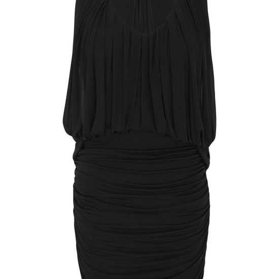 Sleeveless draped minidress from saint laurent featuring black, draped design, ruched detailing, round neck, sleeveless and thigh-length. short jersey dress size and fit - this piece fits true to size. we recommend you get your regular size. model is 1,75m / 5ft 8in wearing size 36 (fr)