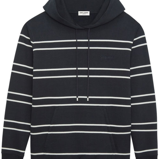 Striped cotton hoodie from saint laurent featuring black, cotton, embroidered logo at the chest, horizontal stripe pattern, drawstring hood, long sleeves, front pouch pocket and ribbed cuffs and hem. striped cotton hoodie size and fit - this piece fits true to size. we recommend you get your regular size. model is 1,84m / 6ft 1in wearing size m