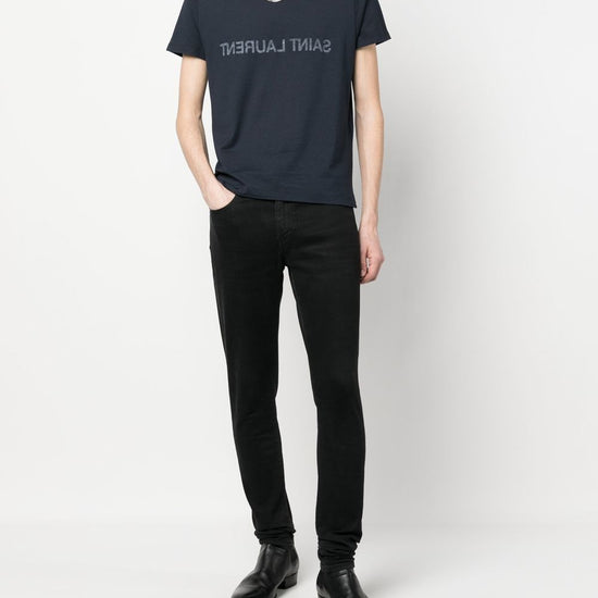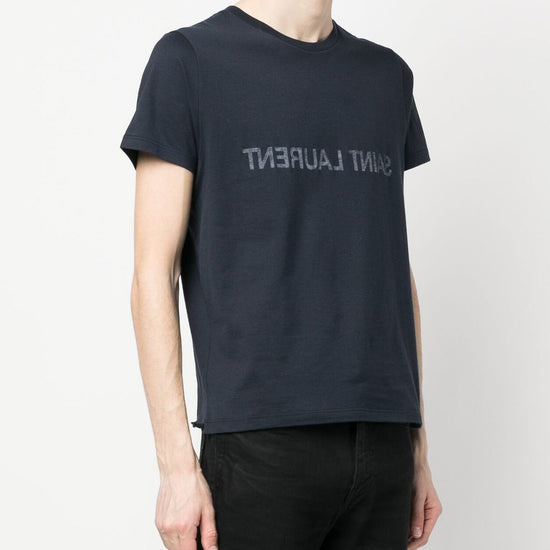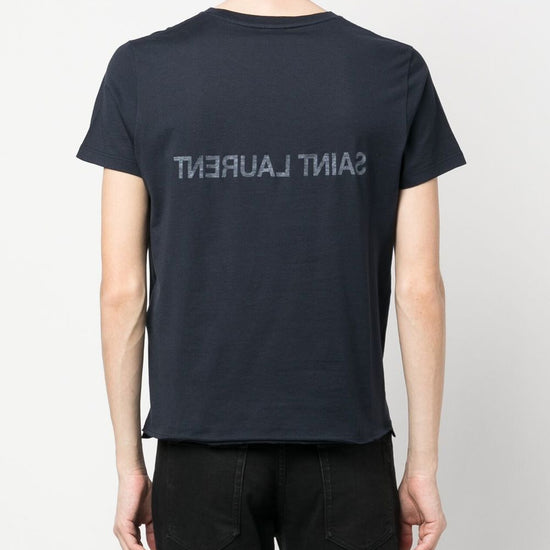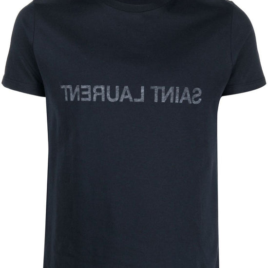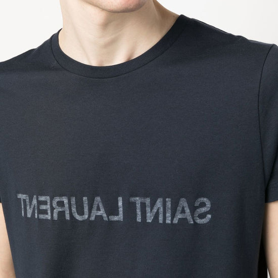 Reverse logo-print cotton t-shirt from saint laurent featuring navy blue, cotton, logo print at the chest, logo print to the rear, crew neck, short sleeves and straight hem. logo cotton t-shirt size and fit - this piece fits true to size. we recommend you get your regular size. model is 1,84m / 6ft 1in wearing size m