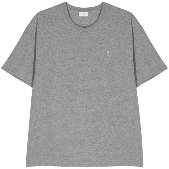 Medium grey cotton blend piqué weave mélange effect ribbed crew neck embroidered cassandre logo at the chest short sleeves straight hem logo cotton blend t-shirt