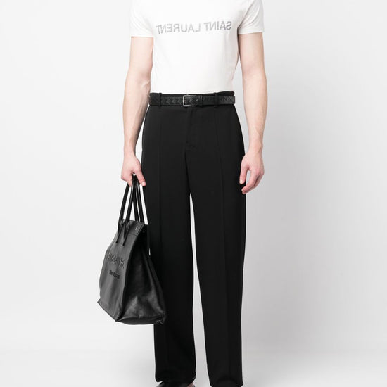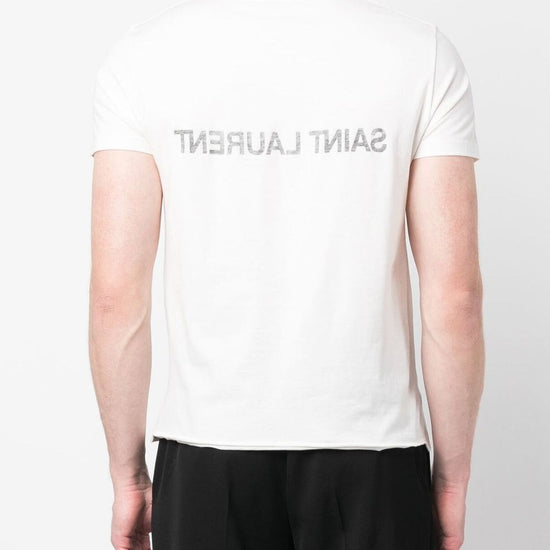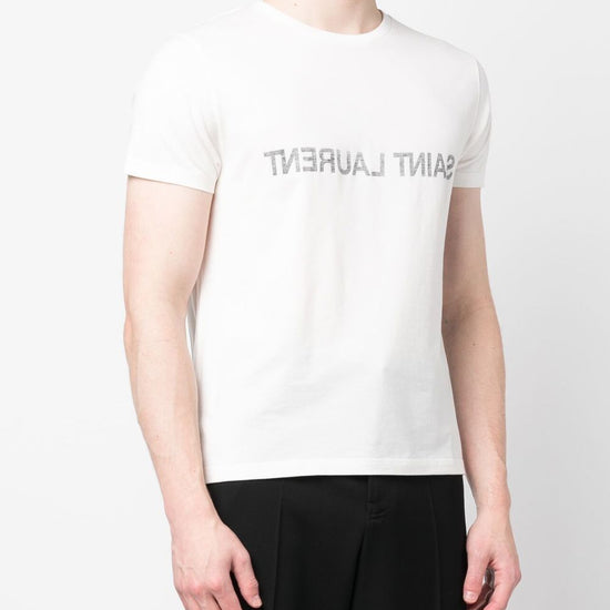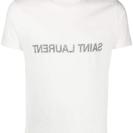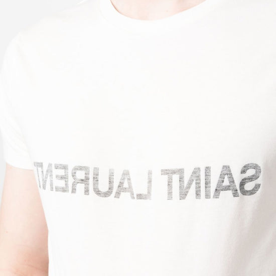 Reverse logo-print t-shirt from saint laurent featuring white/black, cotton, short sleeves, round neck, straight hem and internal printed logo. logo cotton t-shirt size and fit - this piece fits true to size. we recommend you get your regular size. model is 1,84m / 6ft 1in wearing size m