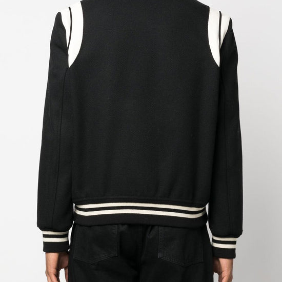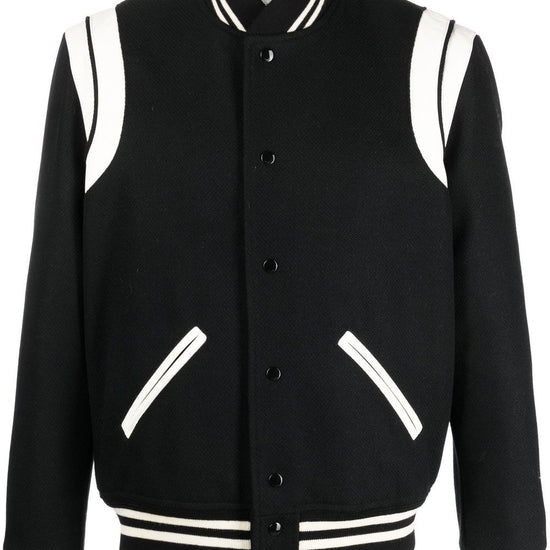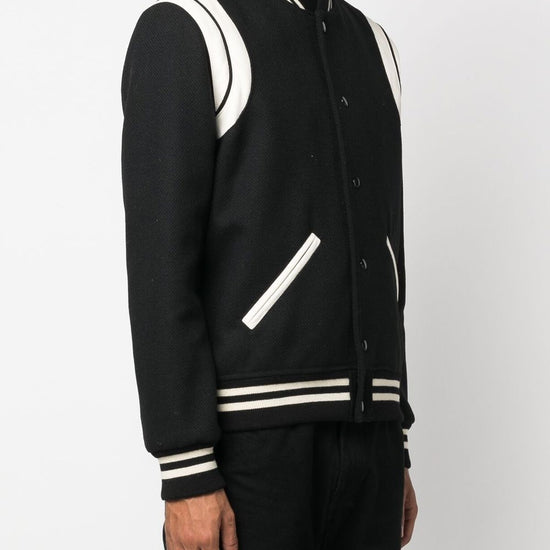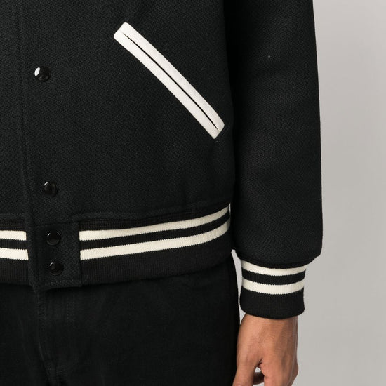 Inspired by varsity codes, this black and white eddy bomber jacket from saint laurent is legendary. worn by a cluster of celebrities, it boasts universal appeal that you'll want to be a part of. you'll want this one in your collection. featuring a ribbed collar, a snap button closure, front welt pockets, long sleeves, a ribbed hem and cuffs, a full lining and a striped trim. wool bomber jacket size and fit - this piece fits true to size. we recommend you get your regular size. model is 1,84m / 6ft 1in wearing size 48 (it)