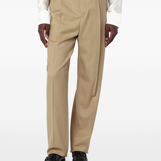 High-waisted, made from certified wool, carrot-fit cut featuring a single pleat. concealed button, hook and zip fastening, two slanted pockets on the front, two buttoned welt pockets on the back, belt loops at the waist. wool trousers