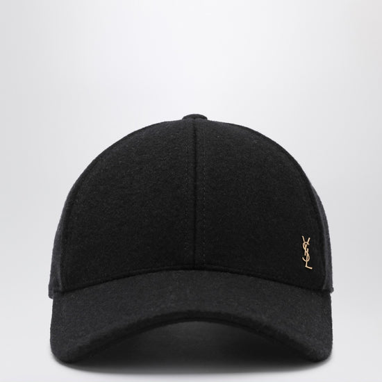 Saint laurent black felt baseball cap, featuring a metal ysl monogram pin with a gold finish on the side and an adjustable strap at the back with an engraved logo buckle.