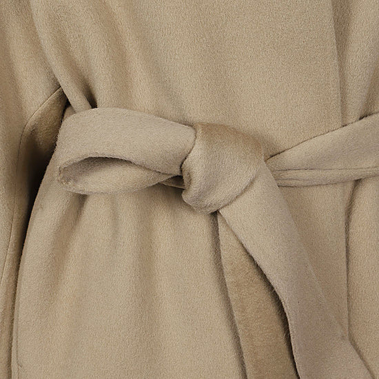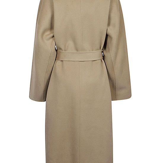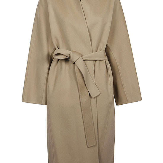 Long minimal black coat made of wool, long sleeves, mandarin collar, open on the front, belt, two welt pockets on the front, contrasting stitching. wool midi coat size and fit - this piece fits true to size. we recommend you get your regular size. model is 1,75m / 5ft 8in wearing size s