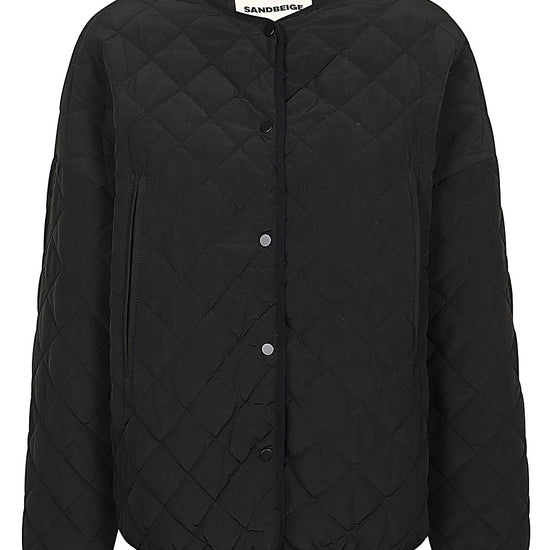 Short cream jacket characterized by quilted texture, long sleeves, mandarin collar, two welt pockets on the front, front closure with snap buttons, soft to the touch. nylon quilted jacket size and fit - this piece fits true to size. we recommend you get your regular size. model is 1,75m / 5ft 8in wearing size s