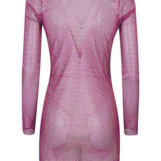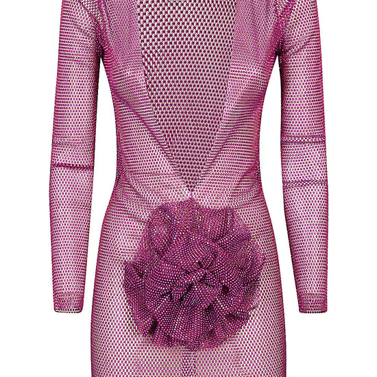Fuchsia short dress, long sleeves, large flower as a decoration in front, large v -neck, front slit. c/fiori flower-applique mini dress size and fit - this piece fits true to size. we recommend you get your regular size. model is 1,75m / 5ft 8in wearing size uni