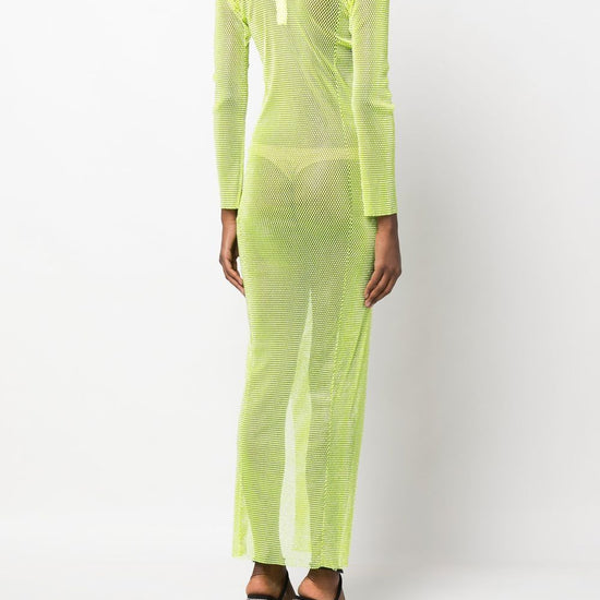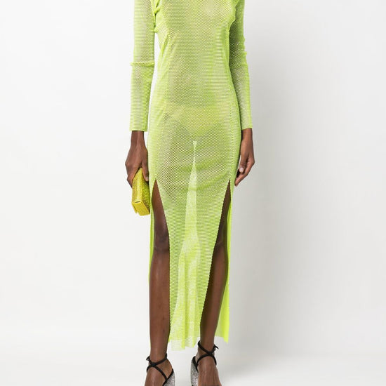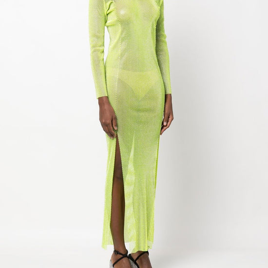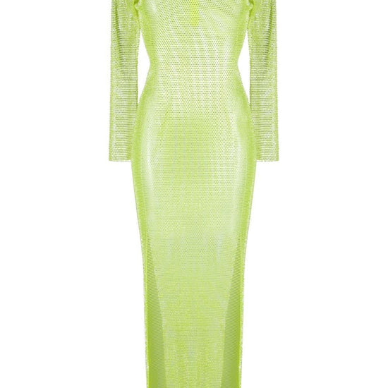 Diamonds rhinestone-embellished mesh maxi dress from santa brands featuring lime green, cotton blend, semi-sheer construction, mesh panelling, rhinestone embellishment, round neck, long sleeves, side slits, rear zip fastening and ankle-length. c/strass rhinestones embellished long dress size and fit - this piece fits true to size. we recommend you get your regular size. model is 1,75m / 5ft 8in wearing size uni