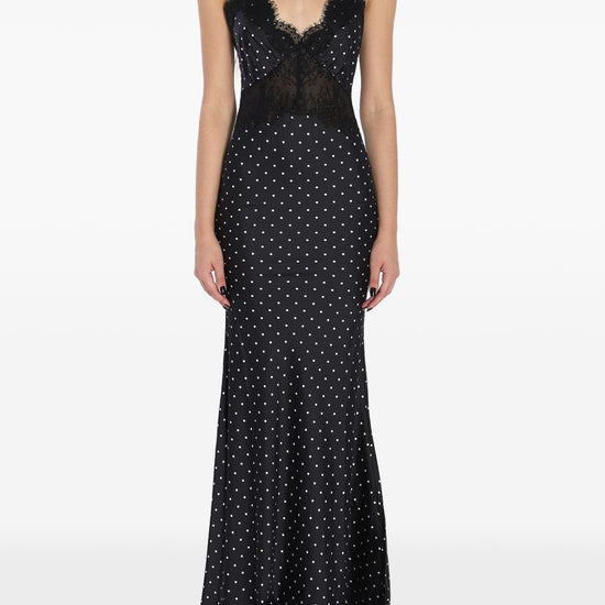 Black polka dot print lace detail thin straps deep neckline front button closure polka dot long dress