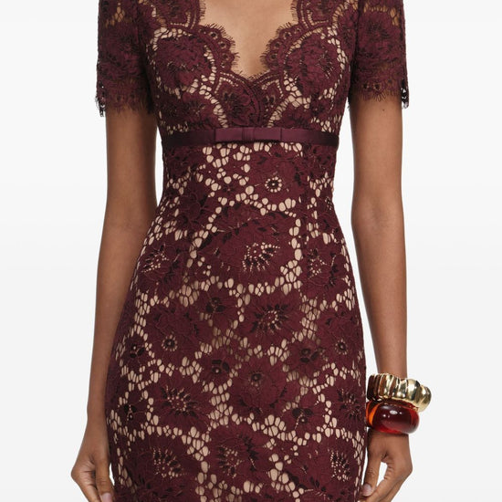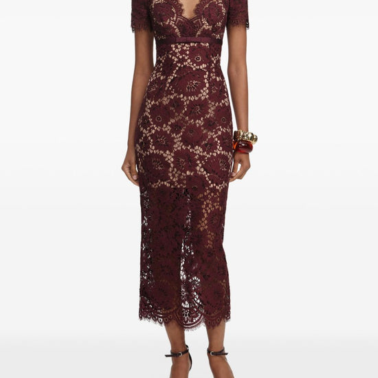 Burgundy floral lace v-neck short sleeves fitted bodice midi length v-necked midi dress size and fit - this piece fits true to size. we recommend you get your regular size. model is 1,75m / 5ft 8in wearing size 8 (uk)