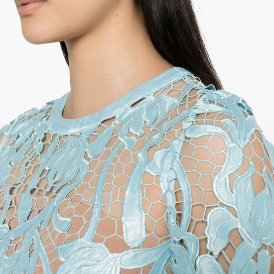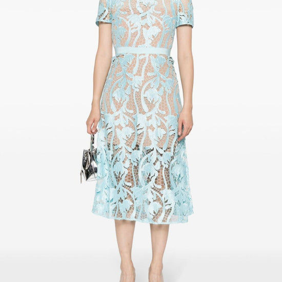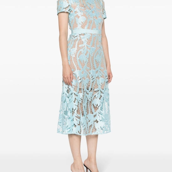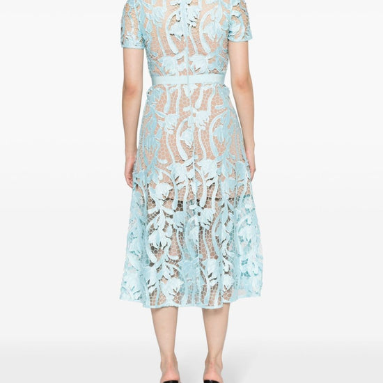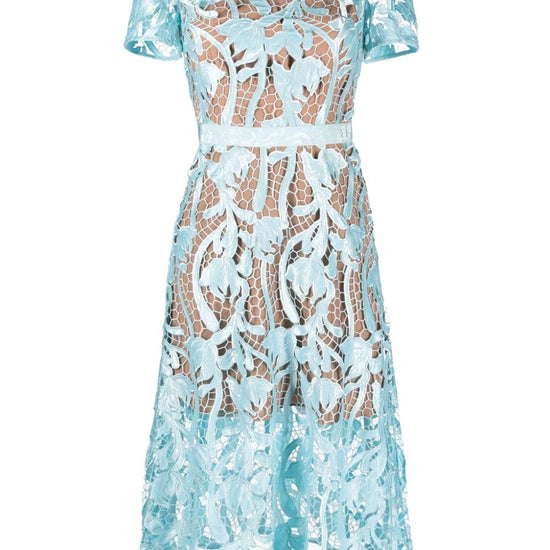 Light blue guipure lace round neck concealed rear hook and zip fastening short sleeves fitted waistline belted waist flared skirt straight hem partial lining mid-calf length lace midi dress size and fit - this piece fits true to size. we recommend you get your regular size. model is 1,75m / 5ft 8in wearing size 8 (uk)