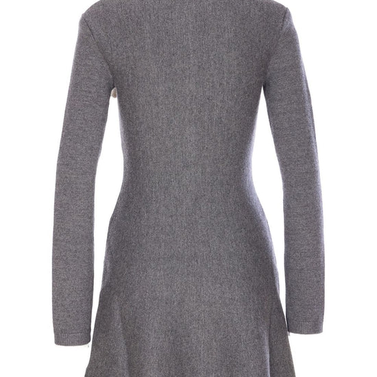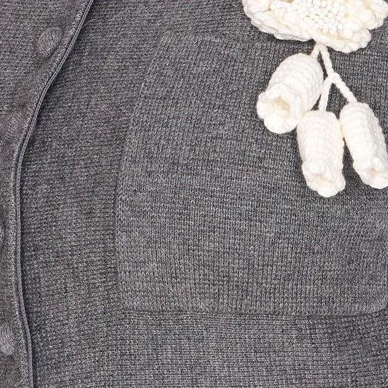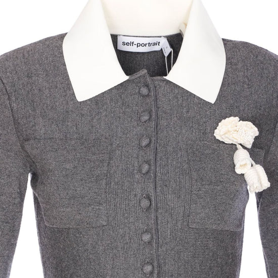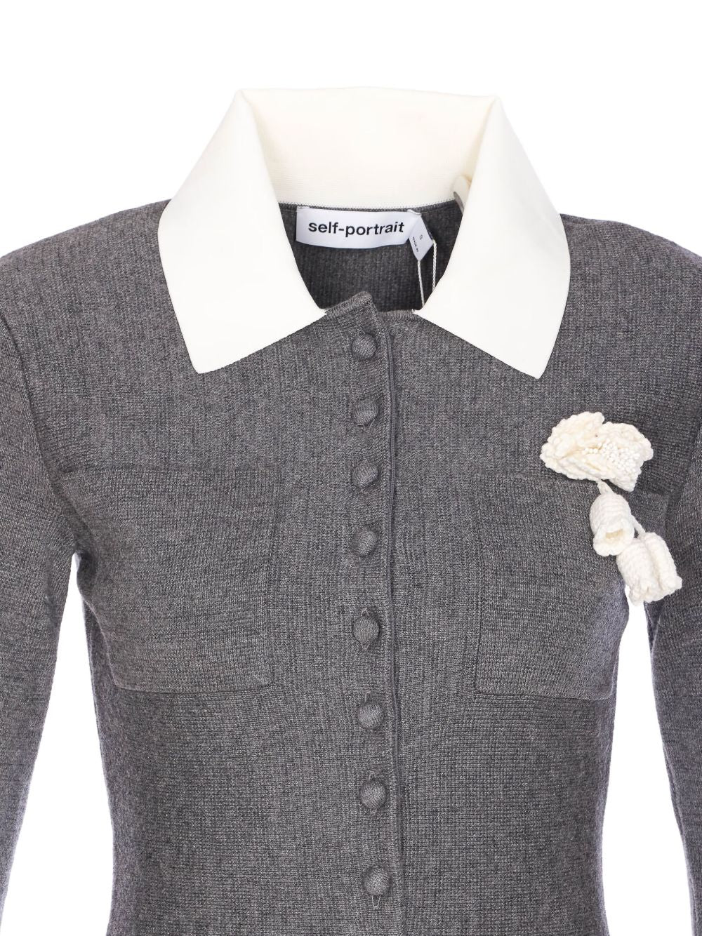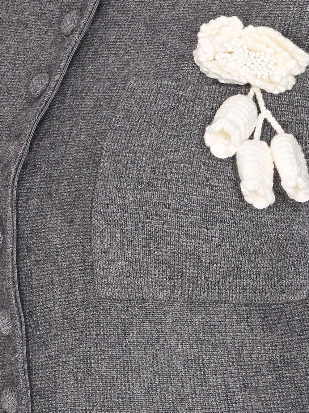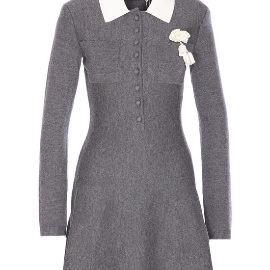 Grey crochet flower embellishment collared neckline button front fastening long sleeves patch pockets wool blend short dress