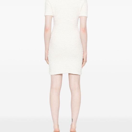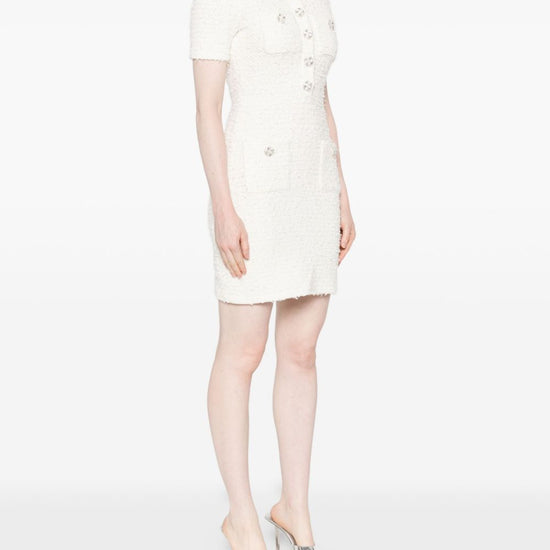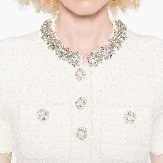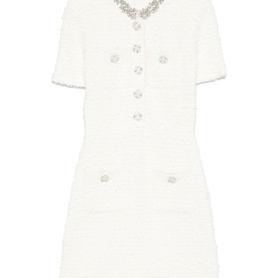 Cream jewel-embellished neckline short sleeves button detailing patch pockets crystal embellished dress