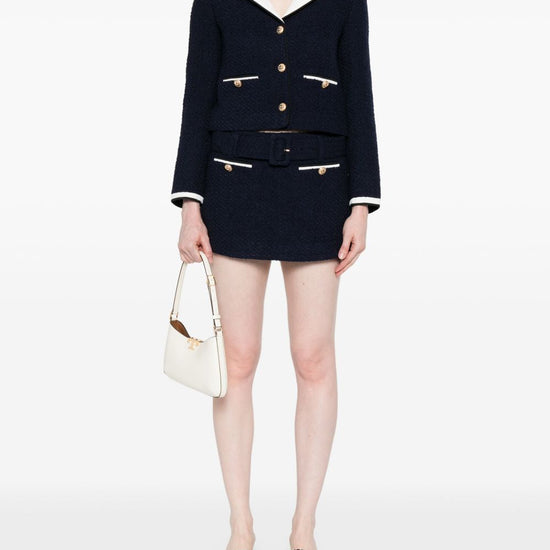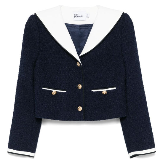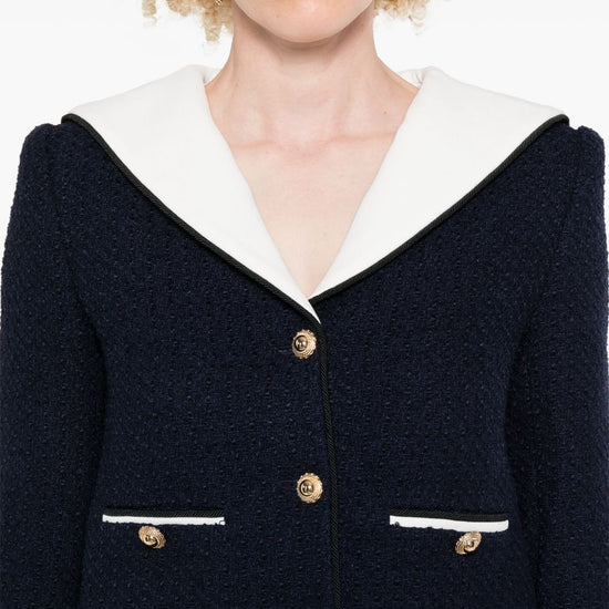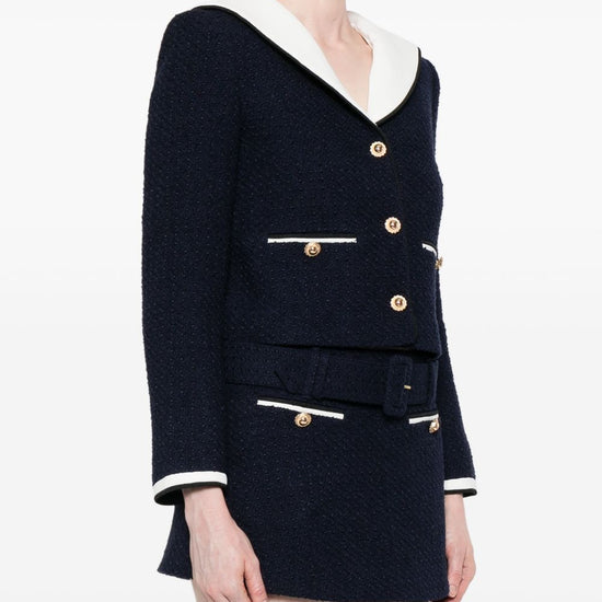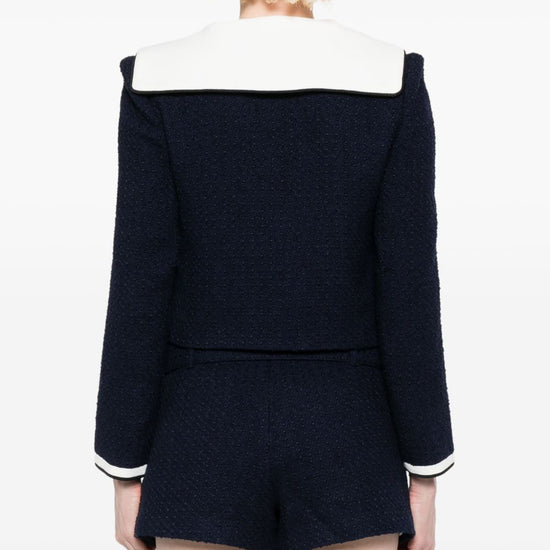 Navy blue front button fastening two front welt pockets stripe trim contrasting collar bouclé short jacket size and fit - this piece fits true to size. we recommend you get your regular size. model is 1,75m / 5ft 8in wearing size 8 (uk)