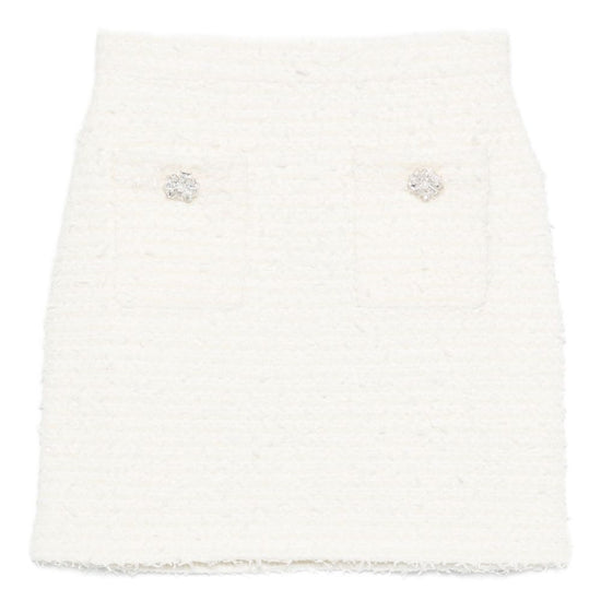 Beige tweed texture pearl embellishment button detailing a-line shape crystal embellished mini skirt