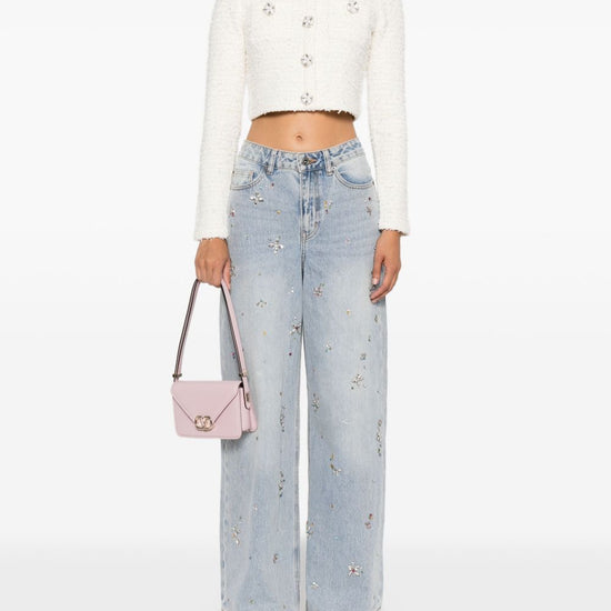 Cream crystal embellishment neckline front button fastening textured boucle knit frayed hem crystal embellished cardigan