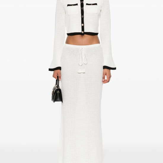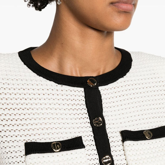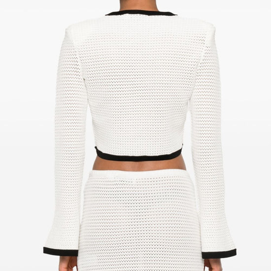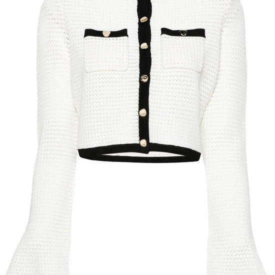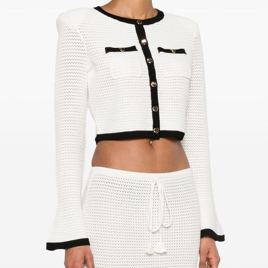 White/black pointelle knit contrasting ribbed trim round neck front button fastening long sleeves flared cuffs cropped straight hem unlined crochet cropped cardigan size and fit - this piece fits true to size. we recommend you get your regular size. model is 1,75m / 5ft 8in wearing size s