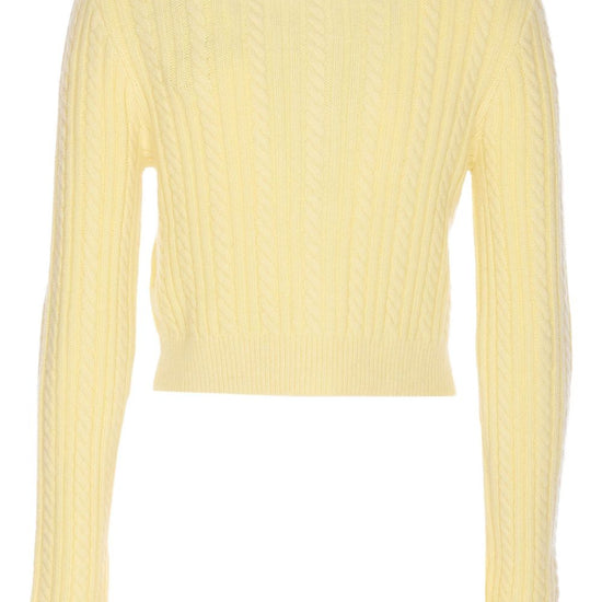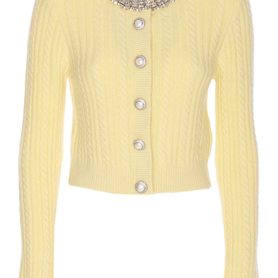 Pale yellow cable knit crystal-embellished collar jewelled button-closure long sleeves crew neck crewneck cardigan