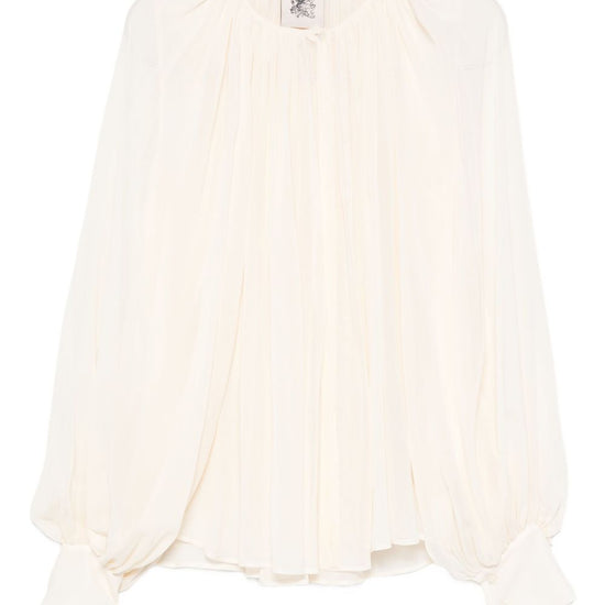 White pleated detail long sleeves button fastening cuffed sleeves round neck silk blend blouse