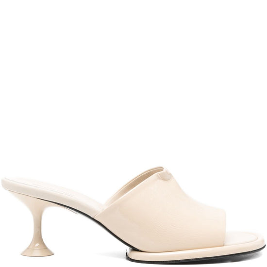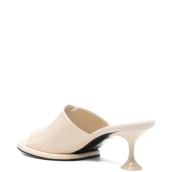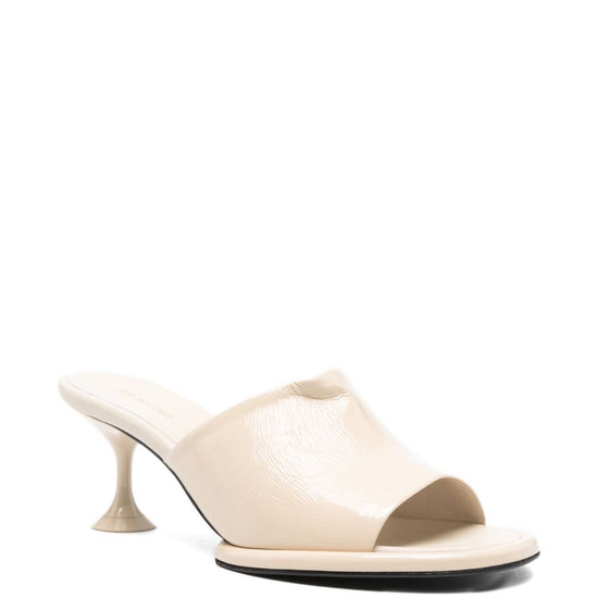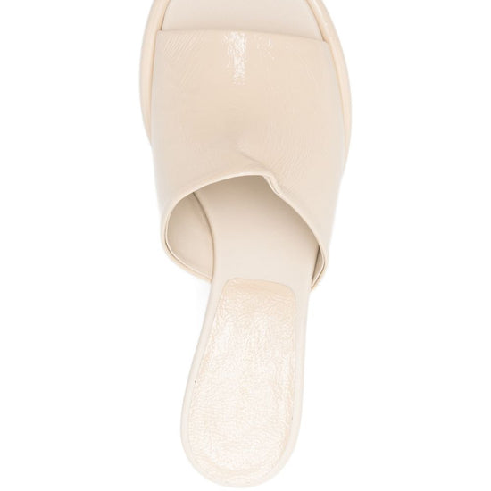 Beige laminated effect open toe this piece comes complete with a protective dust bag. leather heel mules