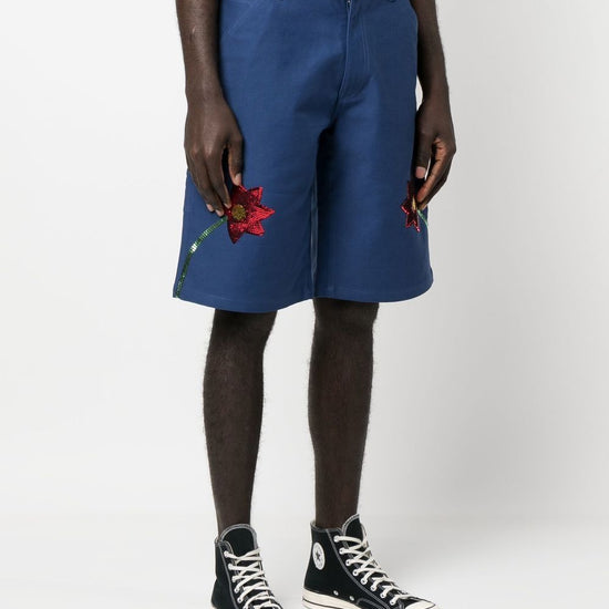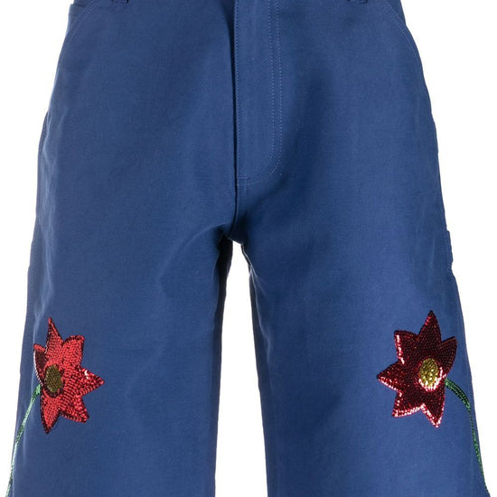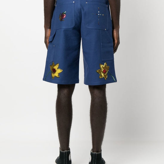 Sequin-embellished detail shorts from sky high farm featuring sequin embellishment, belt loops, front button and zip fastening, two side inset pockets, rear patch pocket, royal blue, cotton and knee-length. embroidered denim shorts size and fit - this piece fits true to size. we recommend you get your regular size. model is 1,84m / 6ft 1in wearing size m