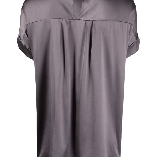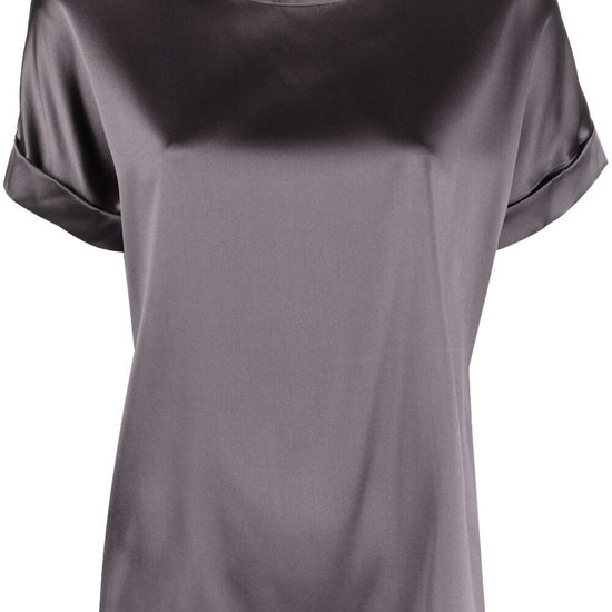 Short-sleeve silk blouse from snobby sheep featuring anthracite grey, silk blend, satin finish, crew neck, rear button fastening, short sleeves and straight hem. silk crewneck shirt size and fit - this piece fits true to size. we recommend you get your regular size. model is 1,75m / 5ft 8in wearing size 40 (it)