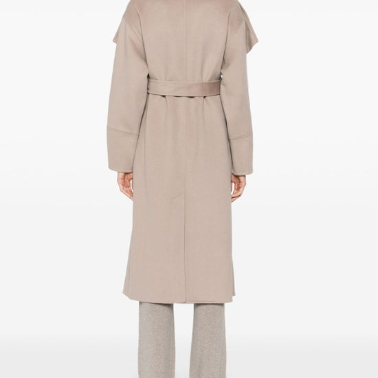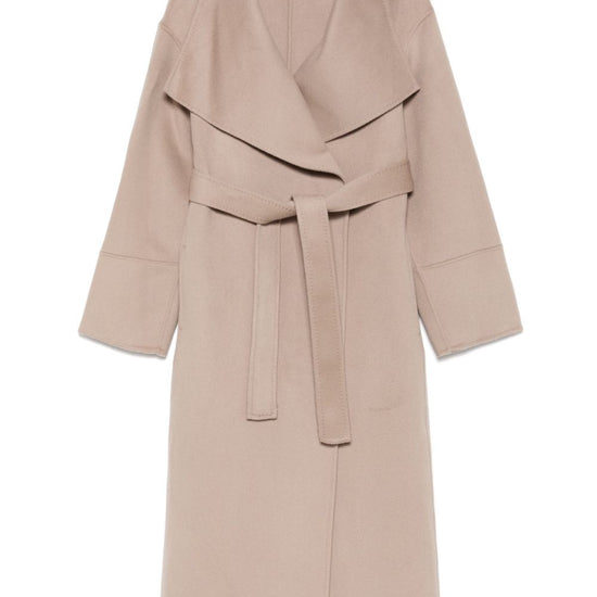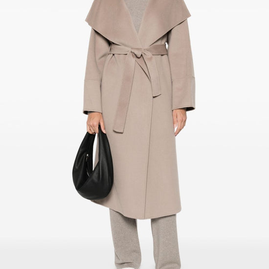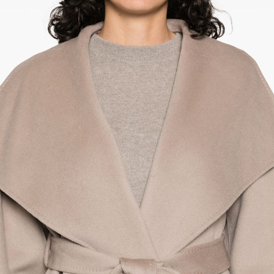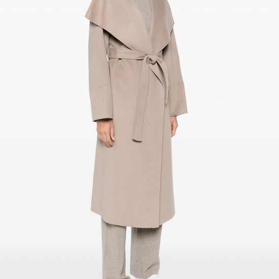 Sand beige shawl collar long sleeves central rear vent below-knee length cashmere belted coat