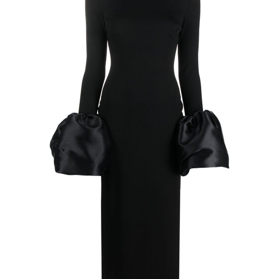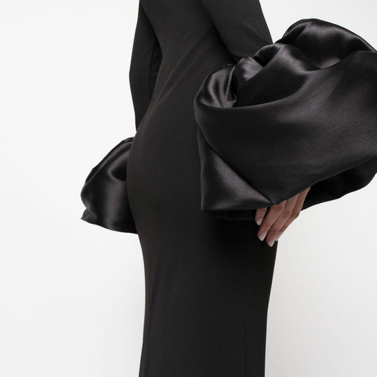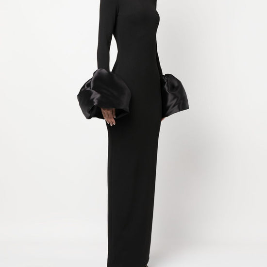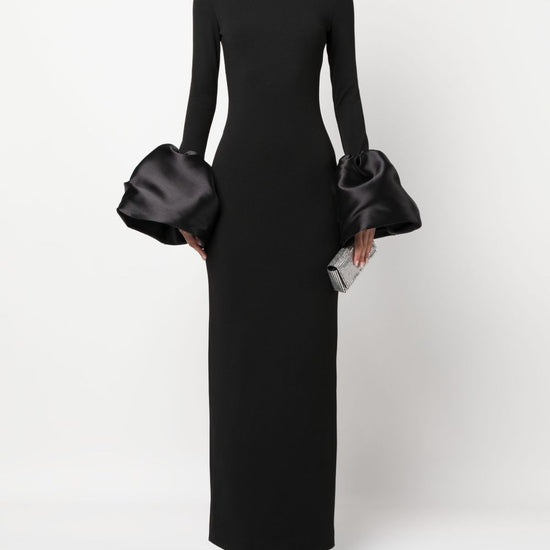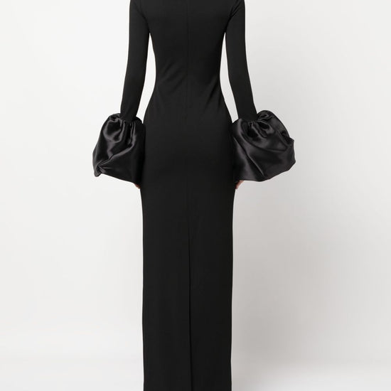 Black stretch-design duchess satin weave mock neck rear zip fastening long sleeves flared cuffs ankle-length straight hem viviana maxi dress