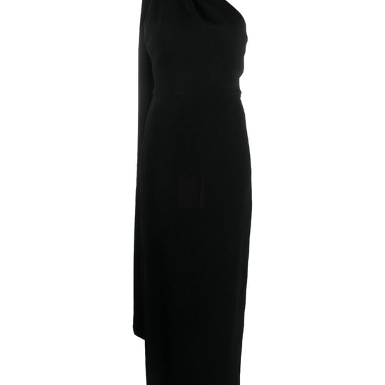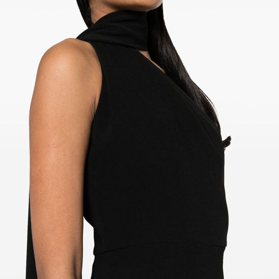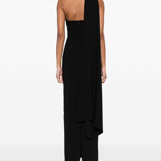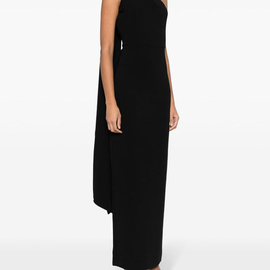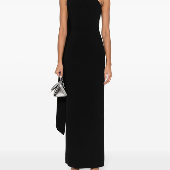 Black fitted waistline crossover neck halterneck tie fastening concealed rear zip fastening one-shoulder straight hem ankle-length demi maxi dress