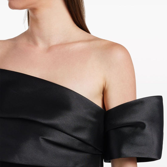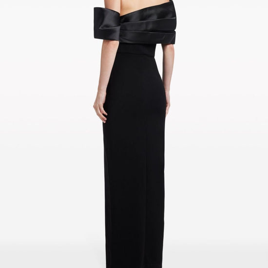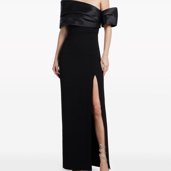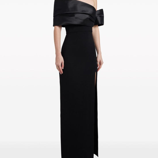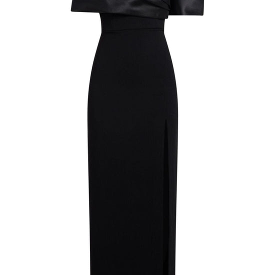 Black satin trim front slit off-shoulder short sleeves long length straight hem alexis masi dress