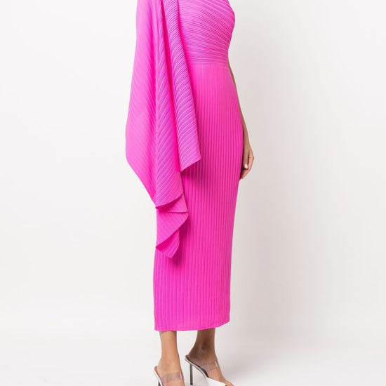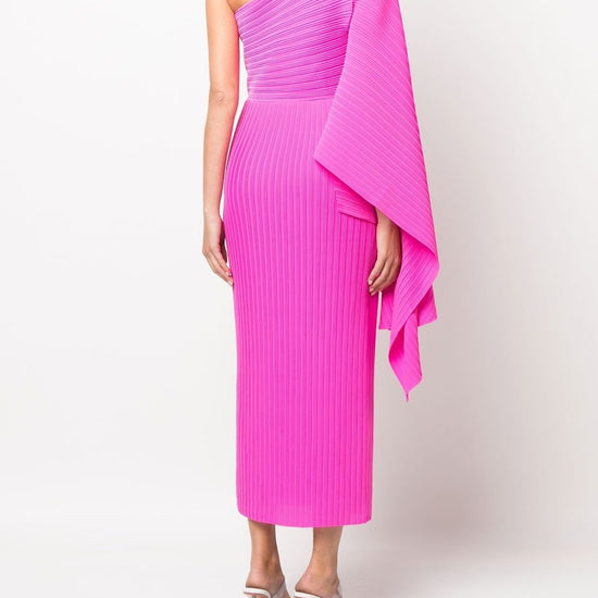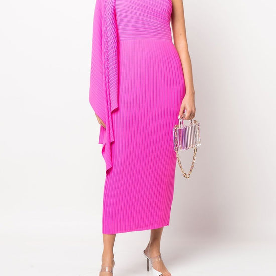 Ribbed one-shoulder dress from solace london featuring fuchsia pink, ribbed detailing, one-shoulder, single long sleeve, draped detailing and mid-length. lenna one-shoulder midi dress size and fit - this piece fits true to size. we recommend you get your regular size. model is 1,75m / 5ft 8in wearing size 8 (uk)